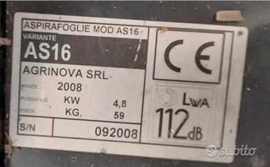 Vendo aspiratore da sponda a benzina usato pochissimo (solo circa 20 ore!), motore Briggs & Stratton AS16 da 4.8 KW, adatto per l'aspirazione di foglie, erba e oggetti leggeri da cortili, viali, condomini, parcheggi, giardini pubblici e parchi. L'aspira-foglie è progettato per essere agganciato con facilità a qualsiasi sponda di camion e scaricare il materiale aspirato direttamente nel cassone o nella vasca.Il materiale in entrata viene triturato dalle pale in acciaio ed espulso dal camino regolabile nella direzione che pi si preferisce. E' privo del tubo in poliuretano che andrà comprato nuovo (valore circa 200 euro). Eventuale spedizione ed imballo a carico dell'acquirente. NO affaristi perditempo e procacciatori di foto. Per informazioni chiedere con messaggio.