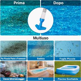 Aspiratore Piscina Ricaricabile Senza Fili, 3 en 1 Aspirapolvere a Mano per Piscina, Pulitore Elettrico per Piscine, Spa, Vasca Idromassaggio - Tempo di Esecuzione 90 Minuti, Blu NUOVO MAI USATO LISTINO 100€ 【Senza Fili e Ricaricabile】Lunghezza massima 165cm, non è adatta per grandi piscine. Questo aspirapolvere spa leggero può aiutarti a sbarazzarti di tubi fastidiosi. La batteria agli ioni di litio integrata garantisce una durata prolungata e prestazioni costanti, rendendola ideale per la pulizia di piccole piscine fuori terra, piccole piscine sotterranee, centri benessere, vasche da massaggio e altro ancora. 【Senza Fili e Ricaricabile】Lunghezza massima 165cm, non è adatta per grandi piscine. Questo aspirapolvere spa leggero può aiutarti a sbarazzarti di tubi fastidiosi. La batteria agli ioni di litio integrata garantisce una durata prolungata e prestazioni costanti, rendendola ideale per la pulizia di piccole piscine fuori terra, piccole piscine sotterranee, centri benessere, vasche da massaggio e altro ancora. 【3-in-1 Pulizia】Questo aspirapolvere per piscina è dotato di testa triangolare, testa lunga e ugello di aspirazione, rendendo facile entrare nelle aree più strette e pulire efficacemente i lati e le scale. Facile rimozione e aspirazione dei detriti accumulati in piscina, come piccole foglie e piccole pietre... 【Lunga Durata di Lavoro】Ci vogliono circa 2 ore per caricare completamente l'elettricità, utilizzare per circa 1,5 ore dopo una carica completa. Non dimenticare di sopraffare l'uscita dell'acqua dalla macchina durante l'uso. 【Assemblaggio Rapido】 Non sono necessari strumenti di installazione, segui le istruzioni incluse per installare il tuo nuovo aspiratore per piscina portatile in pochi minuti, quindi inizia a usarlo per pulire la piscina.
