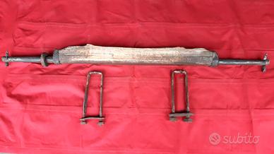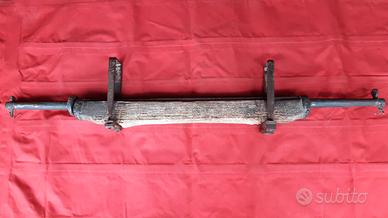 Vendo asse antico in ferro battuto per carretto dell'800, in buone condizioni come da foto, lunghezza 1,09 m, sbarra di ferro larga 3 cm, spessore incastrato nel legno, visibile solo 1 cm, legno largo 5 cm, altezza 5 cm, compreso staffa 7 cm, lunghezza legno 65 cm comprese le ghiere, ghiere dove è incastrato il legno larghezza 2 x 7 cm (diametro), ferro del mozzo dove va la ruota, 20 cm lunghezza, dall'altra parte 21,5 cm con rondella, fino al foro dove c'è spinotto 18 cm, diametro sede ruota 2 cm. 2 staffe lunghe 21 cm, larghe all'interno 5 cm, esterno fuori 7 cm, peso compreso di staffe 8 kg.