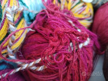 Filati Multicolore: Ci sono anche gomitoli più piccoli con segmenti di colore diversi (giallo, bordeaux, verde).