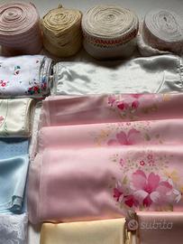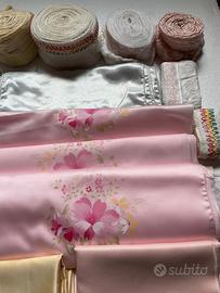 -pezze di raso in vari colori,tinta unita e con fiori rosa dipinti