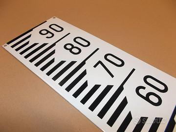 In lamiera smaltata a fuoco, 6 fori predisposti per il fissaggio. Le aste si compongono di moduli universali da montare in continuità , la scala graduata mostra tacche ogni centimetro ed indica a mezzo doppia cifra i decimetri.