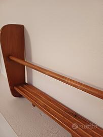 Delizioso attaccapanni proveniente da una scuola elementare in disuso. dotato di mensolina per appoggiare libri , bastone per appendere ombrellini e pomoli per vestiti. misure 86 x 26h .profondità mensola 6 cm