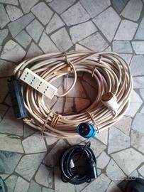30 metri di cavo gommato a tenuta stagna con attacco colonnine camping per roulotte camper o tenda , varie ciabatte e prese più altro cavo per interni veranda o cucinino illuminazione