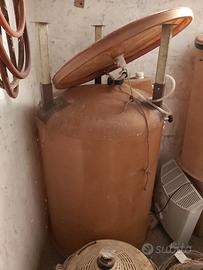 pigiatrice con pompa di rilancio, torchio, pompa di travaso, damigiane, botti in vetroresina, imbottigliatrice e tutta una serie di accessori e utensili.