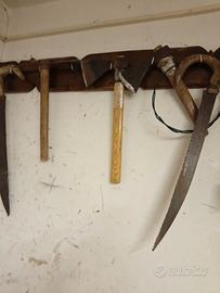 Cavalletti, ceppo per appoggio ,cassa contenitore per legna più due seghe,due accette una roncola e una zappetta