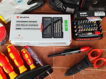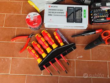 set Punte ferro acciaio inox nuove, BITbox 33 Pz. nuovo, set di cacciaviti isolati c/cerca fase anche questi nuovi, borsa da cintura, forbici F1 Intercale con fodero, tracciatore,nastri e guanti