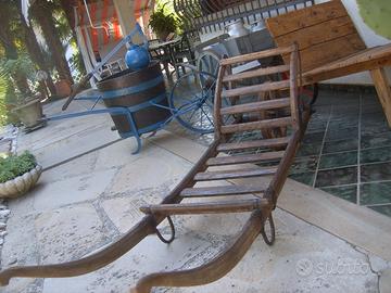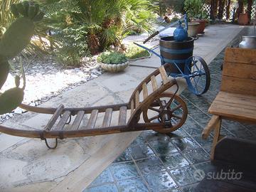 Il grande e antico cariolone lungo che serviva per trasportare i covoni del fieno è un pezzo unico e raro, mai visto, costruito in legno massello di "BOSSO" robustissimo, anch'esso è stato pulito e trattato per prottegerlo nel tempo...molto appariscente...utile anche per fare un lettino prendisole nel Vs. giardino...