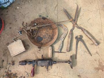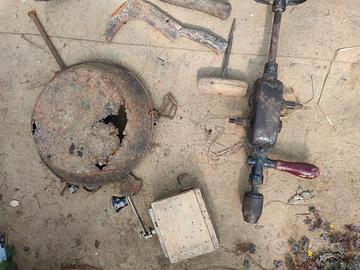 Vendo vari attrezzi da calzolaio, fustelle, presse per bottoni in ghisa, più altri attrezzi come scalpelli, martelli, roncola con manico in corno, base per ferro da stiro, macinino caffè, lucchetti , chiavi, trapano manuale, , ecc
