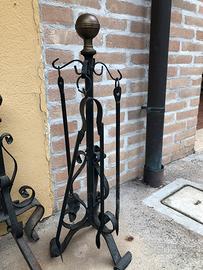 Attrezzi caminetto :alari - brucia legna e porta attrezzi . Ferro battuto . Molto massicci .