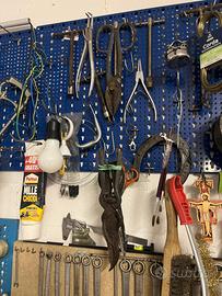 Vendiamo in blocco, causa trasloco, un'ampia dotazione di attrezzatura da lavoro, elettroutensili e utensileria manuale. Ideale per chi vuole allestire o arricchire la propria officina, il garage o per gli appassionati di fai-da-te e meccanica. Prezzo per l'intero blocco: 500 € (Attenzione: vendo solo tutto insieme, non scorporo e non vendo pezzi singoli). Il lotto comprende tutto ciò che vedete in foto, in particolare: Elettroutensili: Mola da banco con levigatrice a nastro BAKAJI Traforo elettrico da banco (modello vintage, stile Dremel Moto-Shop). Smerigliatrice angolare (flessibile) rossa con disco. Seghetto alternativo Agojama. N. 2 Trapani elettrici a filo (uno Agojama, l'altro robusto e vintage). Attrezzatura da Officina e Meccanica: Valigetta chiavi a bussola USAG (Vintage): Set professionale USAG Extra N° 244 1/2 in cassetta di metallo originale, con cricchetto, snodo, prolunghe e bussole. Qualità indistruttibile. Cric idraulico a carrello da pavimento: Portata 1.8 Tonnellate (modello robusto anni '90). Morsa da banco grande in ghisa/acciaio, molto robusta. Morsetto / Piccola morsa da tavolo. Utensileria Manuale Varia: Ampio assortimento visibile in foto (dai pannelli porta attrezzi): set di chiavi fisse e a stella, pinze varie, tenaglie, cesoie per lamiera, cacciaviti, forbici e minuterie varie. Condizioni: Il materiale è usato ma in buono stato, altro mai usato. Ci sono pezzi praticamente nuovi (come la mola Bakaji) e attrezzi vintage di altissima qualità (come il set USAG). Venduto con la classica formula "visto e piaciuto". Ritiro: Dato il volume e il peso complessivo di tutta l'attrezzatura, è previsto esclusivamente il ritiro a mano a Fano (PU).