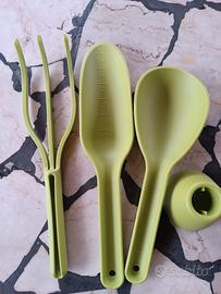set di 3 attrezzi da giardinaggio in plastica dura... rastrellino e 2 tipi di palette che si uniscono in un simpatico e comodo set da appoggio.... nuovi mai usati.