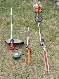 Attrezzo da giardino a scoppio multifunzione. uno si può usare come decespugliatore, tagliasiepi, motosega. l'altro è un decespugliatore a zaino. cedo per passaggio di attrezzi a batteria. Prezzo 100 € l'uno se acquistati entrambi 180