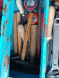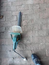 Taglia bordi con batteria e carica batteria. Taglia siepi elettrico. Cassetta attrezzi vari.