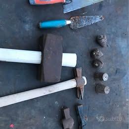 attrezzi da muratore come da foto: 1 mazza da 5 kg con manico, 2 martelli da 400 e 1 da 350 con manico, 5 piombi e 2 cazzuolini. Cedo solo in blocco ad euro 65.00. Se interessati lasciate un recapito e vi richiamo io. Grazie