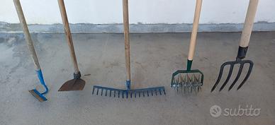 Rastrello, forca, zappa, rastrello aeratore usati pochissimo. Molto resistenti sia la parte metallica sia il manico. Rastrello: 12 euro Zappa: 10 euro Rastrello aeratore: 15 euro Forca: 12 euro Tutto: 45 euro