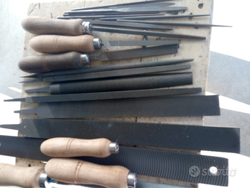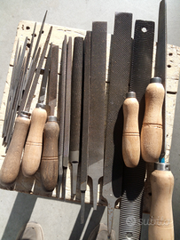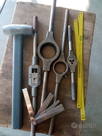 Vario materiale x hobbistica (lime tutti tipi, manici , seghetto ferro con lame, maschi , filiere , compasso con raggio fino a 75cm. raschietto con inserti widia, puntalini regolabili , cuffie antirumore , spessimetro, martello piombo , ganasce x morsa in alluminio e piombo, ecc ) , spazzola metallica diametro 180 mm. carrello porta attrezzi con ruote cm.42x42x88 posso spedire , Prezzi vari .