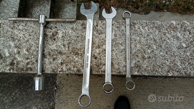 Vendo n.1 chiave a T del 32, n.2 chiavi combinate del 30 e 36, n.1 chiave 25/28, n.1 chiave a snodo per candele, n. 1 chiave a T a snodo esagono da 8, n.1 chiave a T da 13, n. 1 chiave a T snodo da 13, n. 3 porta filiere con filiere da M14 e 1/4 GAS.