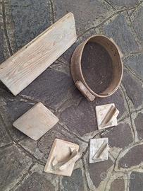 raccolta di vecchi frattazzi anni ’50, costruzione in legno, manici sagomati. In aggiunta anche un vecchio vaglio per la sabbia. Quando il mestiere del muratore era ancora tutto manuale. Usati ma ben conservati, un piccolo museo dei mestieri di una volta. Solo consegna a mano con appuntamento concordato, non si spedisce