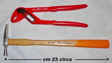 un martelletto N° 386 Mondial + una pinza regolabile (pappagallo) ALARM 12007 + una piccola cesoia per metalli teneri + un morsetto Pastorino + serie di cacciavite USAG 342 Se 5 (5 pezzi).