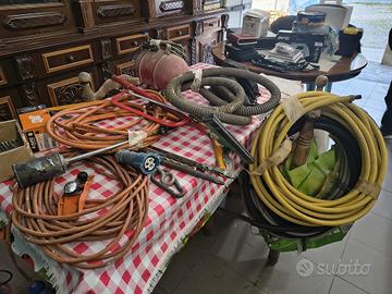 Attrezzi vari per muratore e piastrellista come seguente elenco: -martelletto per demolizione -cannello per guaina catrame -secchi per colle in imbiancatura -morsetti piccoli e grandi -cassetta con attrezzature varie -compressore -aspiratore polvere e liquidi -prolunga cavo corrente 50 m -Faro 1000 watt -Faro 500 watt -porcellino per imbiancare completo -turbo per aria calda -sega per tagliare zoccolino a 30 e a 45 gradi Si vende tutto in blocco al prezzo indicato di €400 Il materiale si trova in zona Nerviano MI