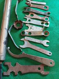 Attrezzi Vintage per Bicicletta, Chiavi a forcella di varie dimensioni e Forme, Tendi Raggi, Pompa in metallo manico in legno, Kit di attrezzi originali , pezzi provenienti da moto Storiche.