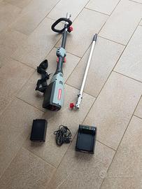 Attrezzo multiuso OREGON per lavori di giardinaggio completo di accessorio taglia siepi, asta di prolunga, batteria 36 V autonomia 1 ora di lavoro, caricabatteria.