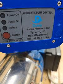 Il kit include anche un presscontrol associato alla pompa, assicurando l’accensione e lo spegnimento automatico. Questo regolatore di pressione intelligente protegge la pompa da eventuali danni dovuti alla mancanza d’acqua, evitando la marcia a secco. Il regolatore di pressione non solo aziona la pompa in maniera automatica, ma rileva la mancanza d’acqua in aspirazione dell’elettropompa bloccando subito il suo funzionamento e quindi proteggendo la pompa stessa da marcia a secco. In caso di blocco del presscontrol viene visualizzato tramite un led rosso lo stato di “failure” sul regolatore stesso.