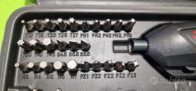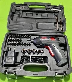Avvitatore a batteria "4V Max" (3,6 V) marca Skil ideale per lavorare in spazi limitati. Tecnologia agli ioni di litio, impostazione di rotazione destra/sinistra garantisce la facilità d'uso durante il lavoro. Il caricatore micro USB, luce LED luminosa, l'indicatore di stato della batteria e il blocco automatico del mandrino. Fornito di serie con una presa esagonale magnetica e può essere utilizzato con punte di cacciaviti standard. Corredato di una robusta custodia con un set di 35 punte per avvitare e per forare. Pari al nuovo, perfettamente funzionante come da foto