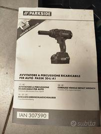 avvitatore a percussione parkside a batterie serie 20V con selezione della coppia e luce led. completo di valigetta e bussole lunghe per smontaggio ruote, usato pochissimo come nuovo , nessun difetto