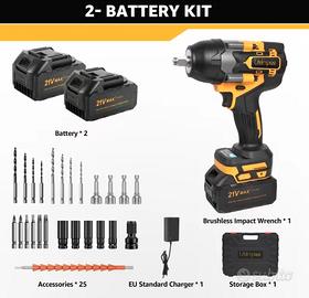 Kit Avvitatore a Percussione Senza Filo 21V Brushless, Pistola a Percussione 1/2" con Coppia Massima di 1000N.m, 4 Velocità e Luce LED, Impugnatura Ergonomica, Include Batteria Li-ion e Caricabatterie Rapido per Riparazione Pneumatici Auto, Fai da Te, Costruzioni e Miglioramenti Domestici, Regalo Ideale per Uomini, Regalo di Natale, Include Punta da Muratore*4, Punta a Spirale*4, Albero Flessibile*1, Punta Avvitatore*6, Setter Magnetico per Dadi*4, Bussole*5, Adattatore per Bussole*1, Custodia.