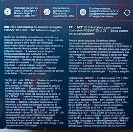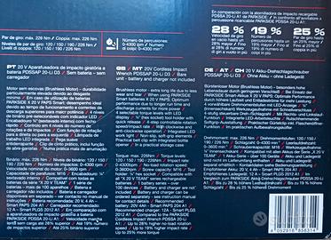 Avvitatore a percussione ricaricabile 20 V Parkside Performance PDSSAP 20-Li D3 Parkside Performance BRUSHLESS MOTOR motore senza spazzole Avvitatore a impulsi Atornilladora de impacto Aparafusadora de impacto N.B. Senza batteria e senza caricabatterie (vedi foto) NUOVO MAI USATO Compatibile con le batterie della serie Parkside "X20 V TEAM" Max coppia 226 Nm Attacco da 1/4" Contenuto nella sua valigetta originale, con tutti i suoi accessori originali. NUOVO, nella sua confezione originale mai aperta, con scontrino per la garanzia di 5 anni su tutto il territorio nazionale italiano. N.B. Senza batteria e senza caricabatterie (vedi foto)