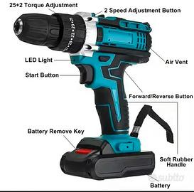 🔩 TRAPANO AVVITATORE 21V A BATTERIA 2 da 48V – POTENZA, AUTONOMIA E VERSATILITÀ! 🔋 Doppia batteria 48V + Accessori + Valigetta rigida 📢 Spedizione in base al colore disponibile – Stesse caratteristiche garantite! Se hai bisogno di un trapano avvitatore potente, pratico e versatile, questo modello è perfetto per te! Adatto per il fai da te, piccoli lavori di casa e officina, offre due modalità di funzionamento: ✔ Avvitatore – Per montaggi e smontaggi rapidi su legno, metallo e plastica ✔ Trapano – Per forare con precisione diversi materiali Grazie al doppio set di batterie agli ioni di litio da 48V, non dovrai preoccuparti di restare senza energia mentre lavori. Il design ergonomico con impugnatura antiscivolo in gomma assicura un utilizzo confortevole e sicuro. 📌 FUNZIONALITÀ E VANTAGGI ✔ Mandrino autoserrante a Frizione relogante 10 mm– Cambio rapido delle punte senza chiavi ✔ 2 batterie 48V ricaricabili – Lavoro senza interruzioni ✔ Luce LED integrata – Perfetto anche per ambienti con scarsa illuminazione ✔ Velocità regolabile (550-1700 RPM) – Adattabile a diverse esigenze ✔ Struttura robusta in metallo e plastica – Resistente e durevole ✔ Valigetta inclusa – Organizza e trasporta il trapano e gli accessori con facilità 📌 SPECIFICHE TECNICHE ✅ Modello: Trapano avvitatore a percussione 21V ✅ Materiale: Metallo e plastica resistente ✅ Batterie: 2x Batterie agli ioni di litio da 48V ✅ Velocità : 550-1700 RPM regolabili ✅ Coppia massima: 7-28 N.m ✅ Mandrino: 3/8" (10mm) autoserrante ✅ Illuminazione: Luce LED integrata ✅ Indicatore batteria: no ✅ Tempo di ricarica: N.D. 📌 CONTENUTO DELLA CONFEZIONE ✔ 1x Trapano avvitatore a batteria 48V ✔ 2x Batterie agli ioni di litio 48V ✔ 1x Caricatore per batterie ✔ 6x Punte per foratura (4-5-6 mm) ✔ 4x Bussolotti (5-13 mm) ✔ 5x Punte cacciavite ✔ 1x Tubo flessibile per fori difficili da raggiungere ✔ 1x Valigetta rigida per trasporto avvitatore a batteria, trapano avvitatore, trapano a percussione,