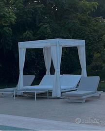 Letto a baldacchino da giardino (non sono in vendita i lettini di fianco e l'ombrellone in primo piano). Schienale regolabile, elegantissimi, completi di tende e materassini. L'ideale per chi vuol arredare il proprio giardino con stile. 2 Pezzi disponibili, usati solo la scorsa estate, Vendiamo per cambio stile arredamento. Ritiro a mano in zona comodissima da raggiungere.