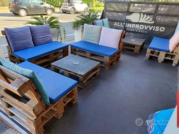 Vendo 6 panche create con i bancali e 3 tavoli in legno, con cuscini su misura.