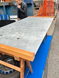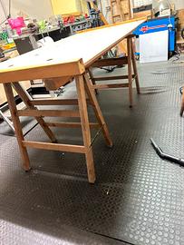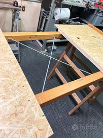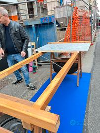 Vendo per inutilizzo, dimensioji totali 250x100, usato una volta sola, un banchetto smontabile adatto per mercatini. È costituito da due cavalletti com fermi, due travetti longitudinali in legno 6x6, tre pannelli 63x100 con sottostante rinforzo e una X in metallo per evitare che si chiuda. Smontato occupa lo spazio di un pannello oltre i travetti che sono lunghi 2,15