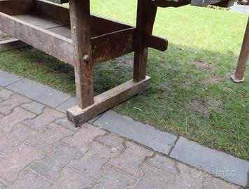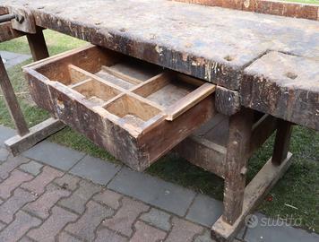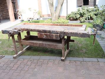 Vecchio tavolo da lavoro in frassino e rovere, completo e strutturalmente in buono stato. Misure del piano 218x94 cm, alto 83m.