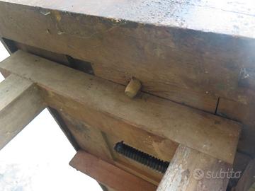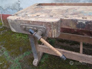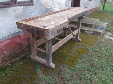Banco da lavoro ancora in ottime condizioni utilizzabile per lavoro o come oggetto d’arredamento. Due morse in legno/metallo, misure cm 230 x 71