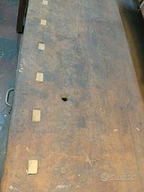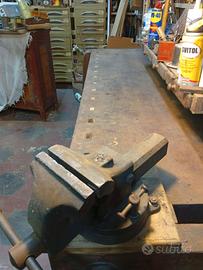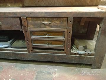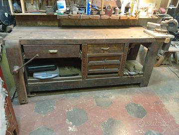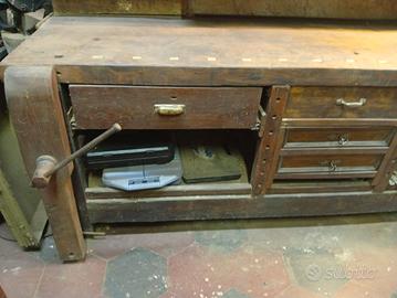 Vendo due banconi da falegname. Quello della foto, usato nella falegnameria di famiglia, ha tanta storia; il piano da lavoro misura 195 cm (208 a fine morsa) di lunghezza x 65 circa di larghezza x 80 cm di altezza due morse in legno (la morsa in ferro della foto puó essere venduta separatamente, a EURO 150,00 ma SCHIARISCO che non fa parte dell'annuncio), quattro cassetti, molto bello, piano di lavoro lisciato. La parte superiore che si vede in foto puó essere vostra per 30 euro, se interessati, senza gli utensili. Ho anche due altri banconi piú economici, ma questo é veramente bello e funzionale! Chiedimi altre foto e video.