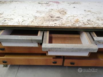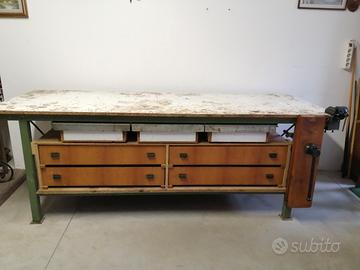 Vendo banco da falegname con doppia morsa, struttura in legno e metallo, avente 3 robusti cassetti con parti in legno e rinforzi in metallo più 4 cassettoni in legno ; togliendoli si possono avere 2 ampi ripiani su cui appoggiare attrezzi o utensili ingombranti. Adatto per lavori fai da te, bricolage. Banco da lavoro molto pesante!