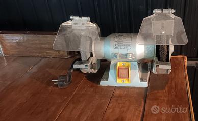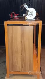 BANCO DA LAVORO CON TELAIO IN FERRO E RIPIANI IN LEGNO, MISURE CM 148 (L) x 48 (P) x 85 (H) COMPRENDENTE 1 MOLA DA BANCO A DUE DISCHI (MOLA SMERIGLIATRICE E MOLA AFFILATRICE) POTENZA 120 KW + UNA MORSA A BASE FISSA . TIPOLOGIA E CARATTERISTICHE COME IN FOTO