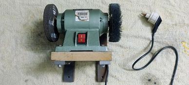 Banco da lavoro completo di morsa con struttura in ferro angolare, due ripiani, largo 131 cm, profondo 60 cm, alto 95 cm. più mola Valex 125. Zona Villa Gordiani.