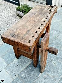 Banco da lavoro/espositore in legno massiccio buono stato con 2 morse.