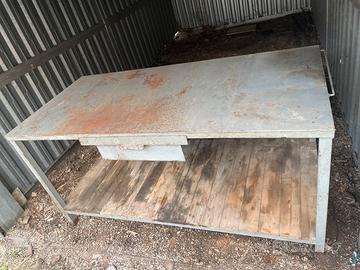 Vendo banco da lavoro molto robusto, struttura in ferro con piano in metallo e ripiano inferiore in legno. Presente ampio cassetto centrale scorrevole. Misure: 170x80x86 cm Condizioni buone, con ruggine superficiale.