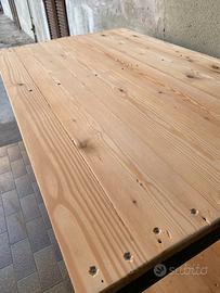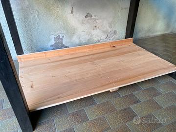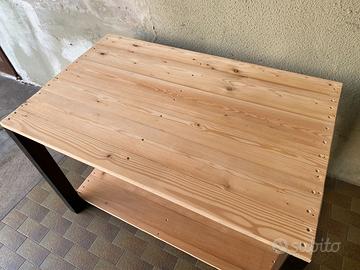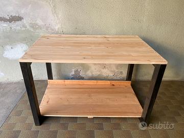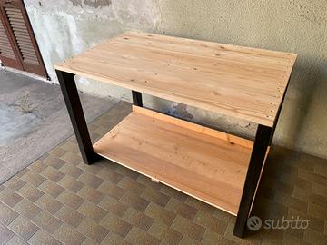 Vendesi banco da lavoro in legno, con due ripiani e struttura molto solida. Realizzato con legno riciclato, i due ripiani sono costituiti da assi con intagli ad L e fissati ai telai con colla per legno e viti.