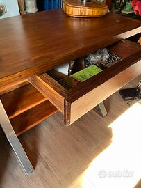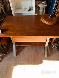 Tavolo o banco da lavoro artigianale ,unico . Il piano ,mensole sottostanti e ampio cassetto sono in legno massello di abete rosso. La struttura molto robusta e in ferro smaltato . Stima 950€