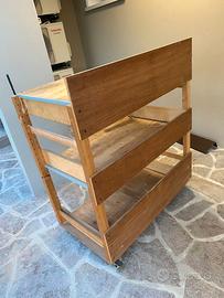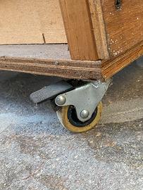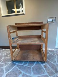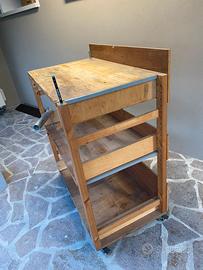 Banco da lavoro autocostruito, molto robusto, con due ripiani, quattro ruote piroettanti con blocco. Altezza piano di lavoro 98 cm Altezza schiena 107 cm Lunghezza 90 cm Profondità 51 cm