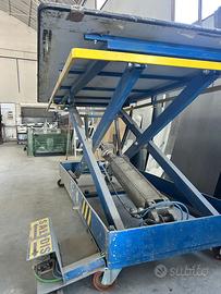 Struttura robusta in acciaio con meccanismo a pantografo, piano di lavoro ampio e stabile, adatto alla movimentazione e lavorazione di materiali pesanti.