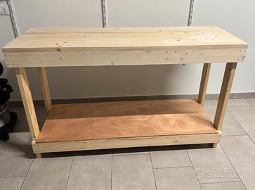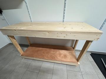 Banco da lavoro o bancone in legno per taverna o studio.costruito in legno di abete ripiano superiore e tutti i laterali di 3 cm di spessore, ripiano inferiore in okumé, il tavolo non é smontabile in quanto é assemblato con colla da esterno e spine di legno di faggio e verniciato con 3 mani di vernice opaca trasparente atossica per legno. Le 4 gambe misurano 45x80mm il banco misura 90cm di altezza 150 di larghezza e 50 di profondita. Peso circa 40 kg