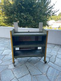 Struttura solida in legno,dotato di 3 ripiani e ruote girevoli per un facile spostamento.